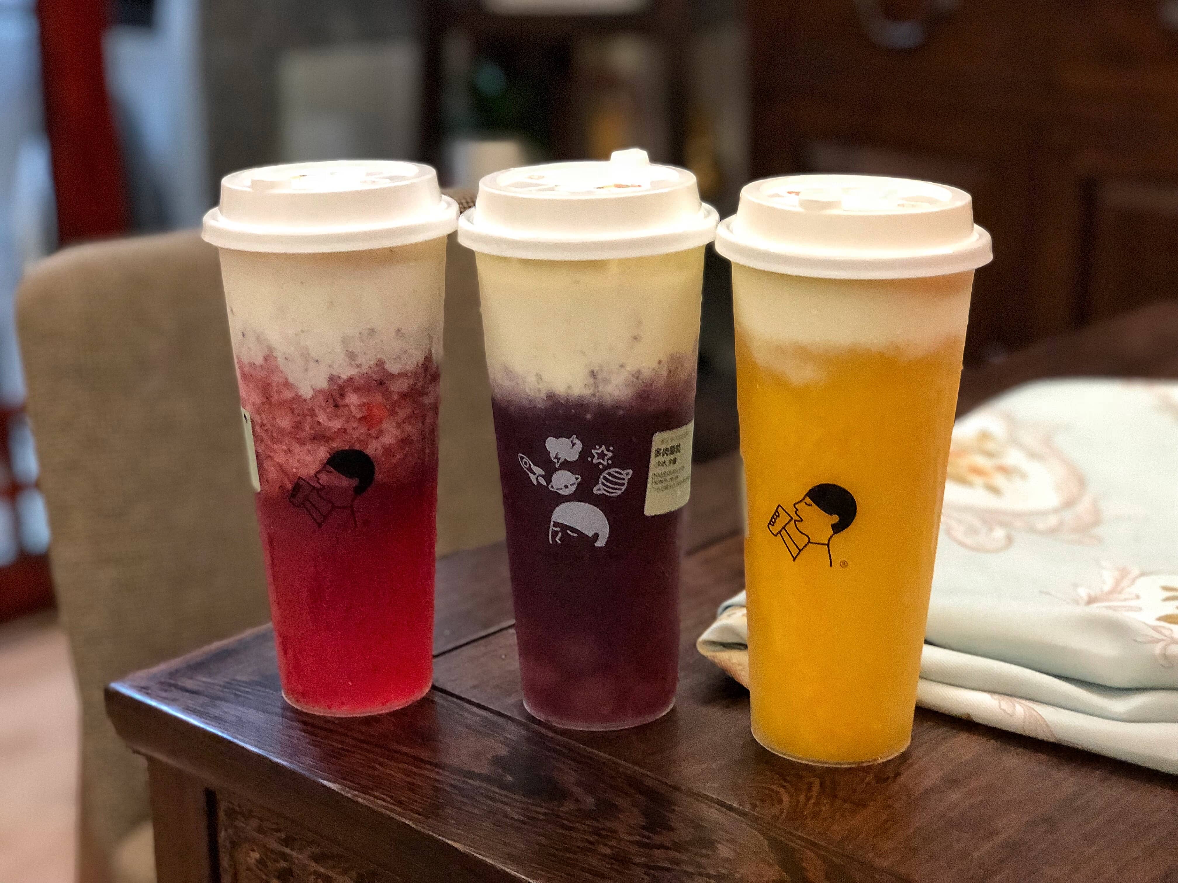 While brown sugar boba is starting to gain traction in the states, the black sugar boba is not quite on the same level of popularity just yet. I personally don't love the licorice taste of the black sugar, but I for sure see the appeal of this drink. Just as brown sugar, or really any sugar, can be caramelized, black sugar can be as well, and that’s what you see above. The “Fiftea” bubble tea photo next to it was unfortunately more disappointing -- Antonia knew it was a well-known chain, so she suggested we try it. The bubbles were fine, but we didn't love the tea flavor as much. My dad said his milk tea tasted good, so maybe it’s just the fruit teas we had.
