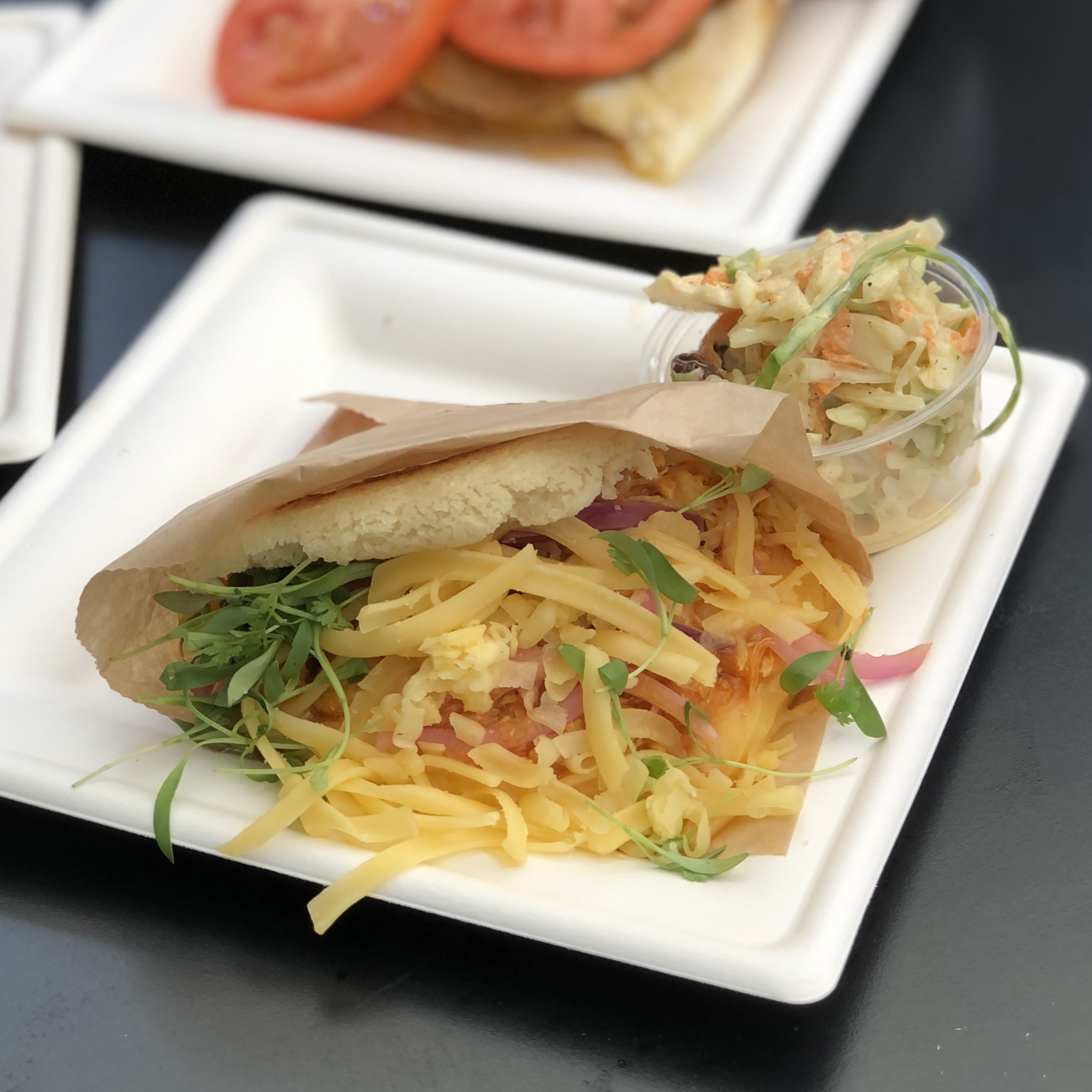 🍚 Dish Description: Stewed chicken breast in a honey-tomato marinara, imported Gouda Cheese, fresh cilantro and our house-made sweet pickled red onions. Choose your favorite side of sauce. Served with slaw or beets.