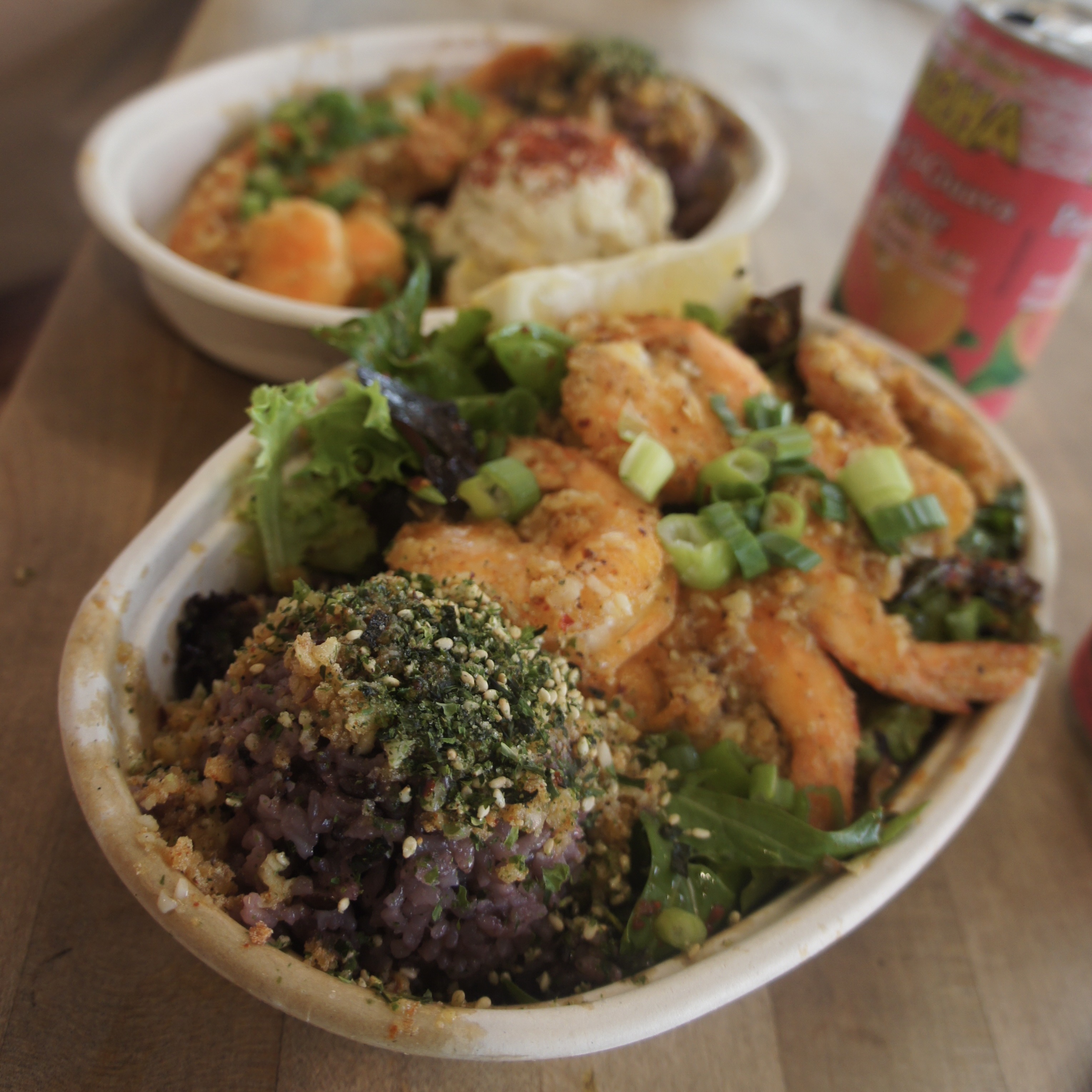 🍚 Dish Description: Garlic butter shrimp (6pc shell on) served with purple rice and Korean greens (tossed green salad, green onion, chili sesame vinaigrette) – everything at this restaurant is GF (except items explicitly with bread/buns/mac)