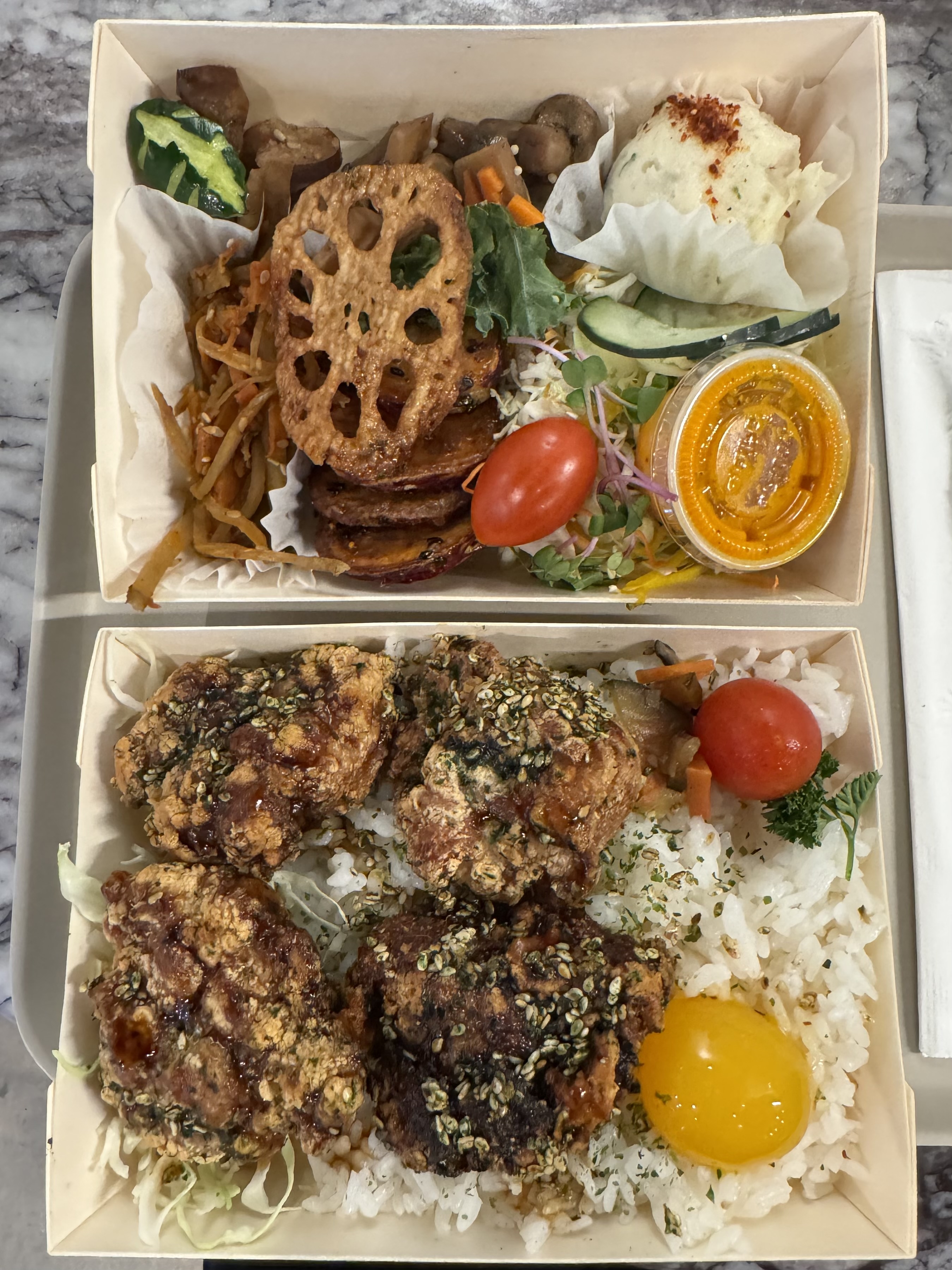 🍚 Dish Description: Jidori Chicken Karaage (Mild or Spicy): Ginger and garlic marinated fried chicken thigh served with peppers, Asian style yuzu kosho mayo and house-made shichimi over aonori furikake topped rice , miso cured egg yolk, and fukujinzuke. Our convenient bento also comes with a separate box containing a variety of vegetables that include: Tokyo diner potato salad, yuzu pickled purple cabbage, tare glazed lotus root, daigaku imo (sweet potato), kinpira gobo & carrots (root vegetable), broccoli namulru, braised friend miso tofu, and grilled zucchini.