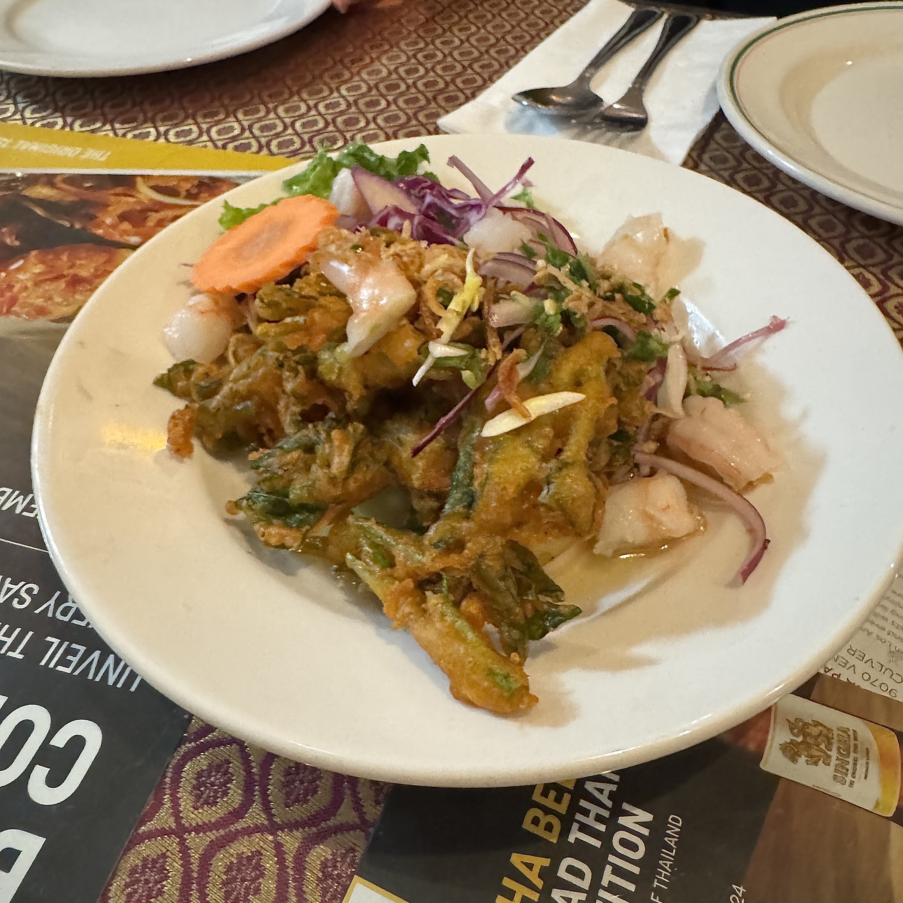🍚 Dish Description: Deep fried morning glory topped with fresh shrimp and a spicy house dressing