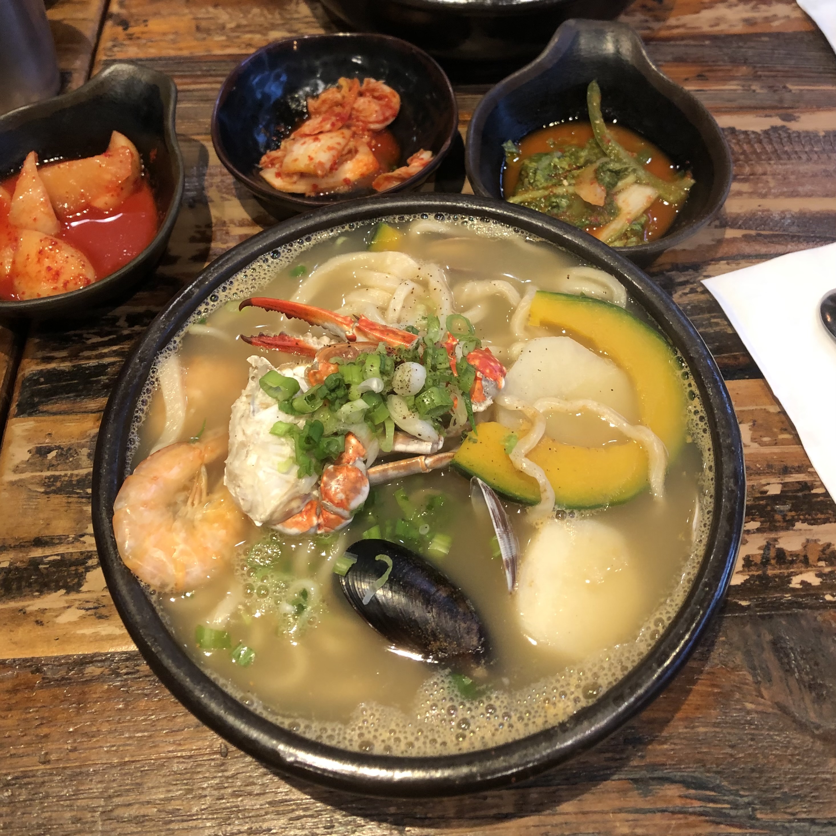 🍚 Dish Description: Knife-cut noodles loaded with clams, mussels, shrimps and 1/2 crab in anchovy broth.
