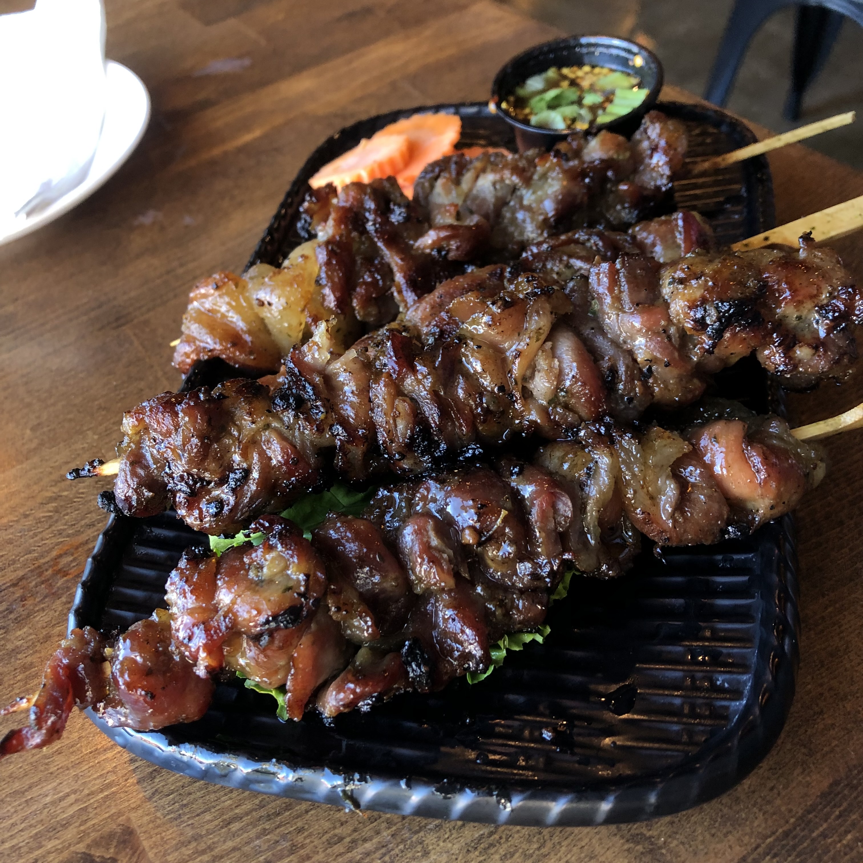 🍚 Dish Description: Popular dish. Gluten free. (During busy hour could take at least 30 mins). The most famous Thai street food, grilled marinated pork on skewers.