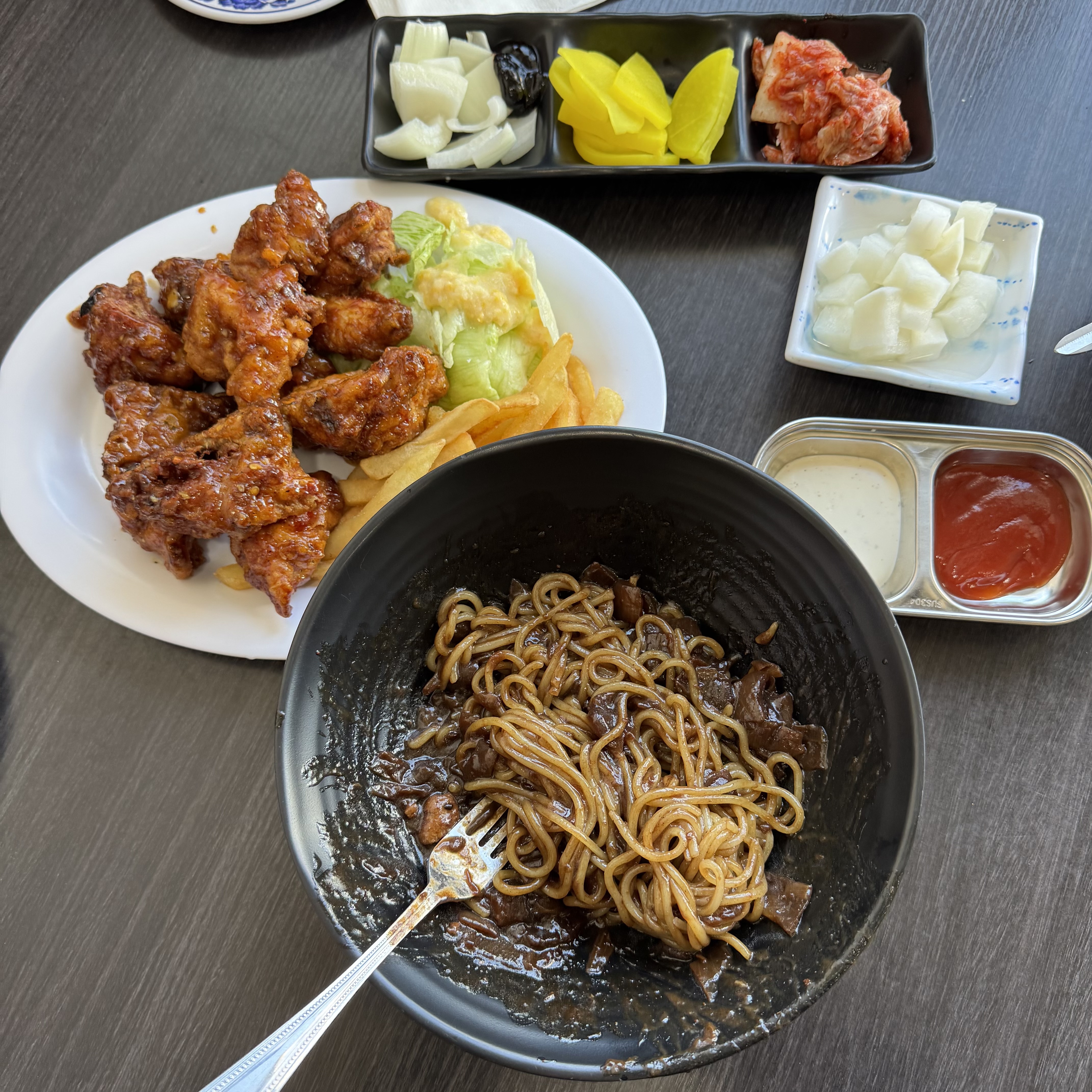 🍚 Dish Description: Black bean noodles and Korean-style fried chicken wings with fries and salad