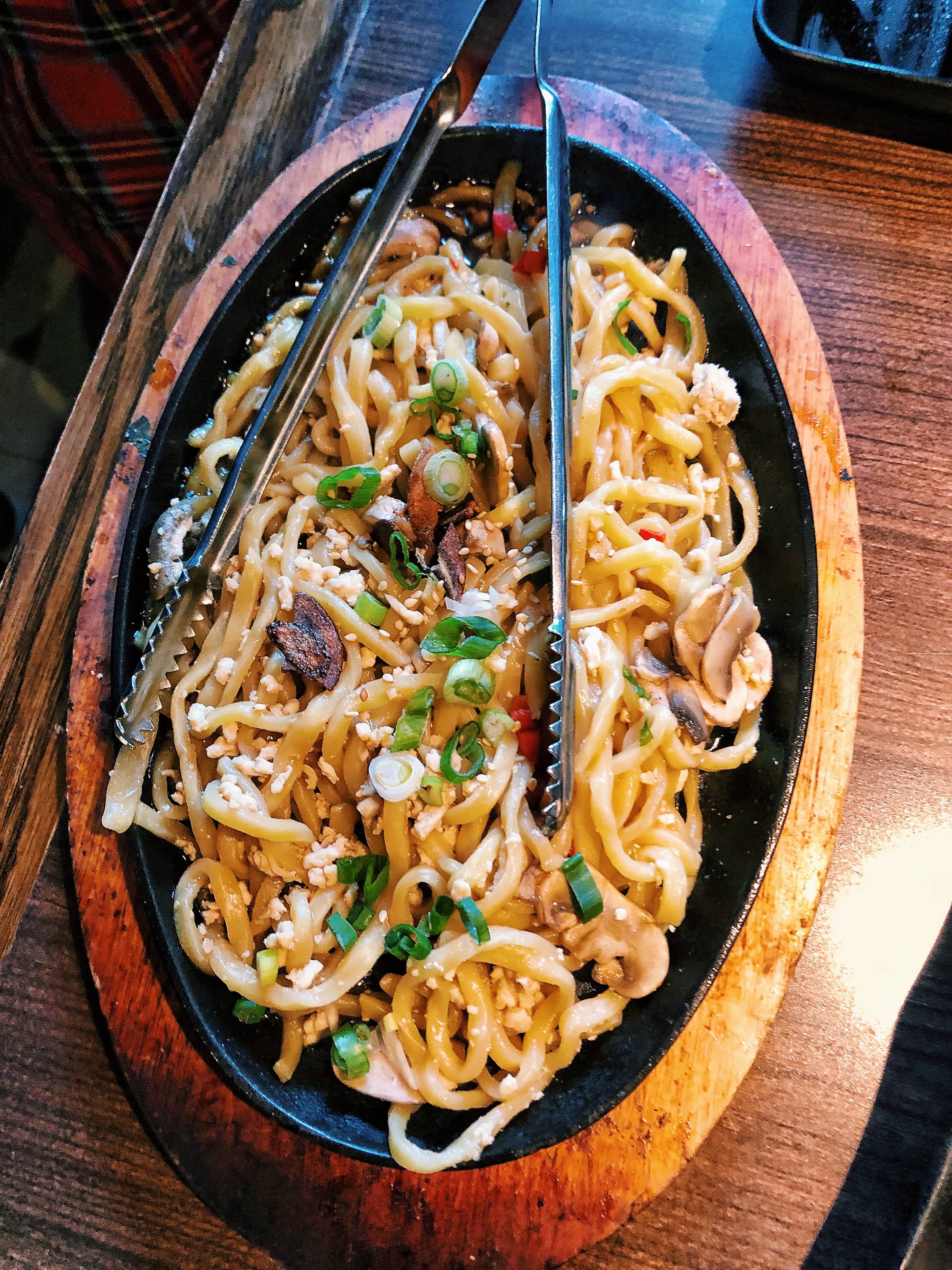 The first dish that Iād like to talk about is their garlic noodles. Let me tell you, if Gyu-Kaku ONLY sold these noodles, Iād be okay with it. This is the first dish I ever ate Gyu-Kaku, and Iāve loved them for as long as I can remember. The dish is made with thick, udon-style, egg noodles that are coated in a slightly sweetened garlic sauce and vegetables. You have the choice of ground chicken, vegetables, or shrimp. Theyāre served on a cast-iron plate, which slightly browns the outsides of the noodles.
