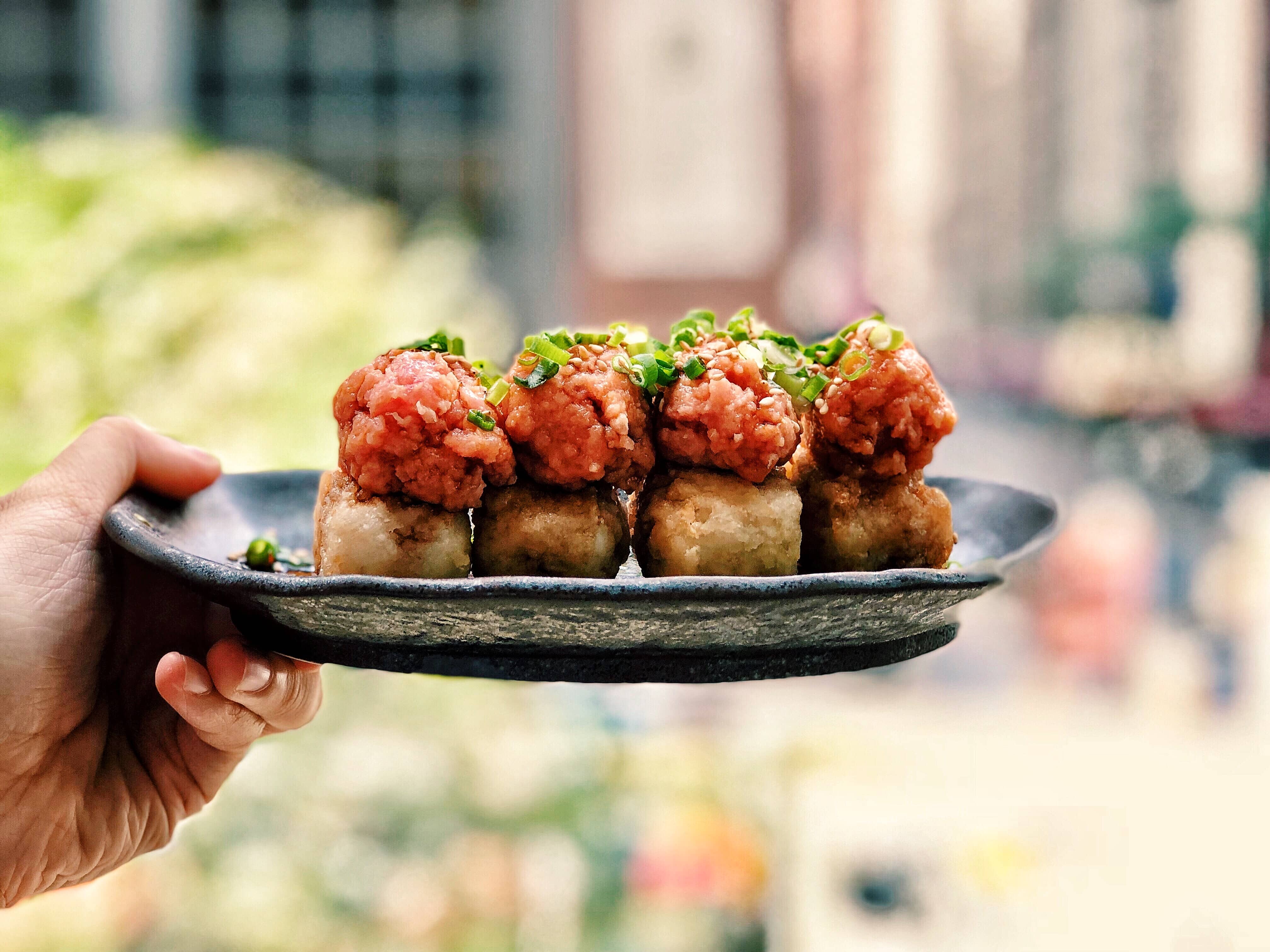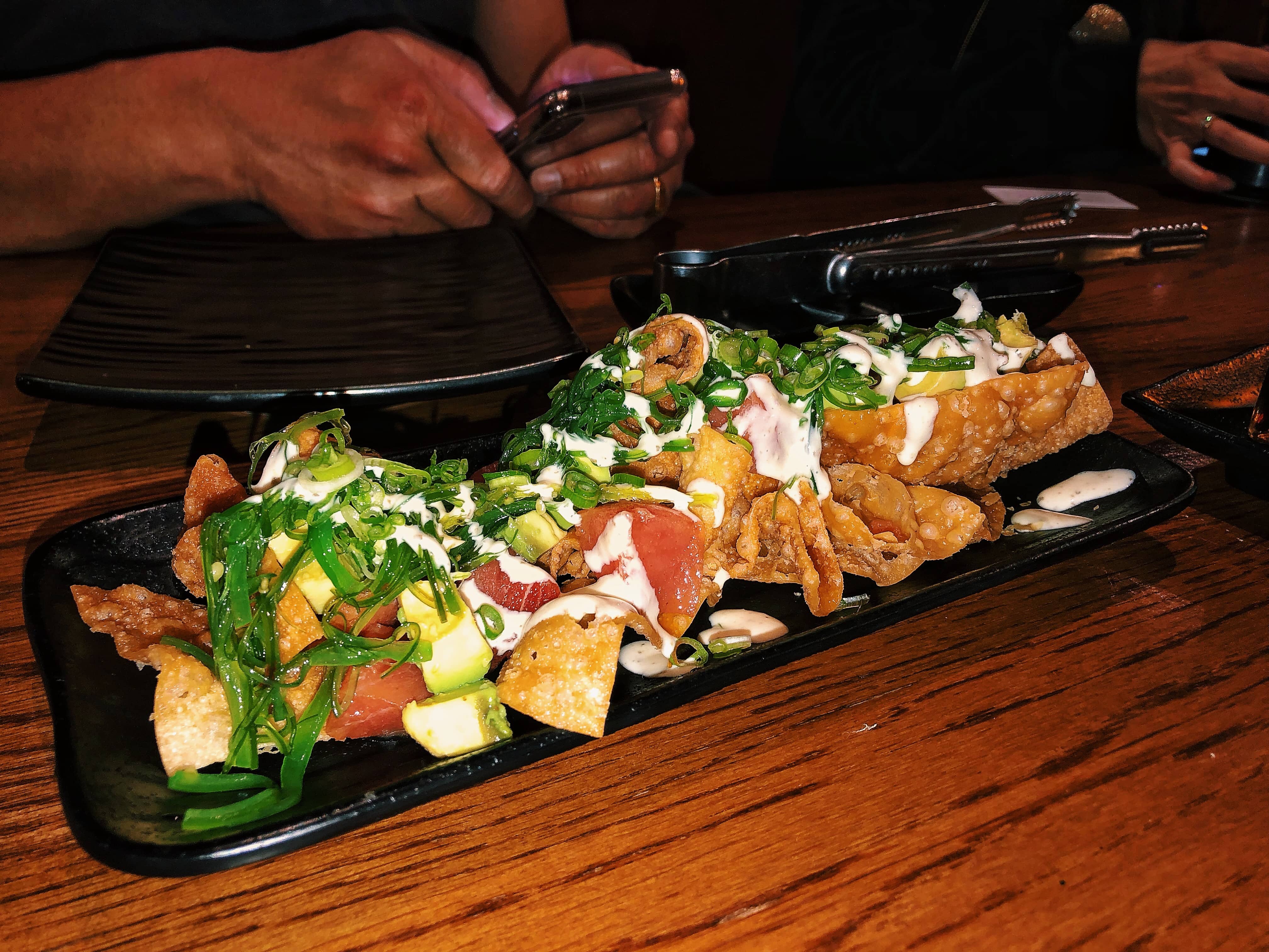 Another dish I love is their absolutely non-traditional, but no less mouthwatering, spicy tuna volcano. Itās a crispy fried block of rice topped with spicy tuna over a layer of Japanese shoyu BBQ sauce. Enough said.