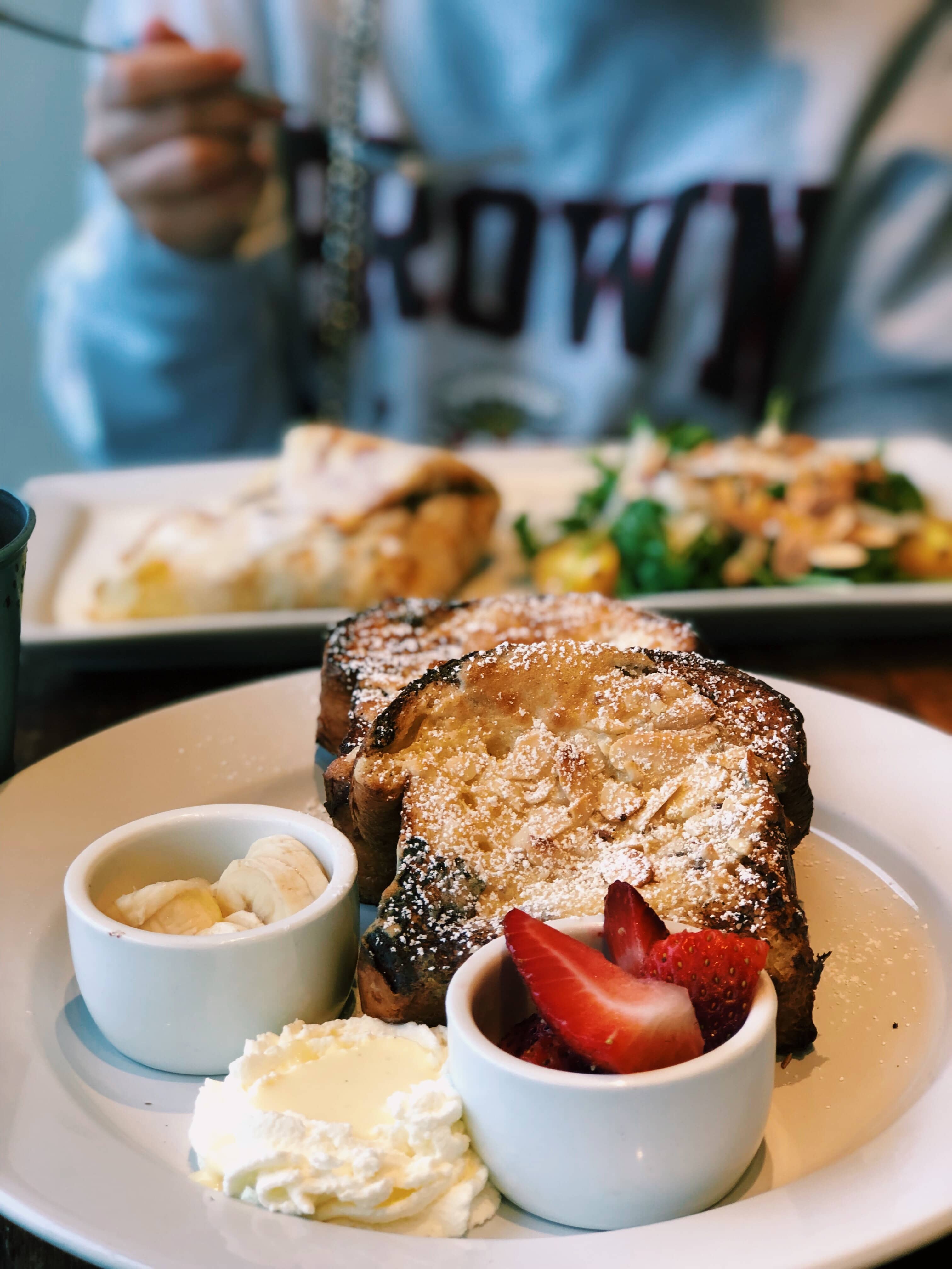 This toast has a custardy filling that makes for the perfect bite. The star of this dish, though, is the vanilla anglaise, a dessert pouring custard sauce, which softens up the toast a little bit. Donāt be shy to ask for extra anglaise!!