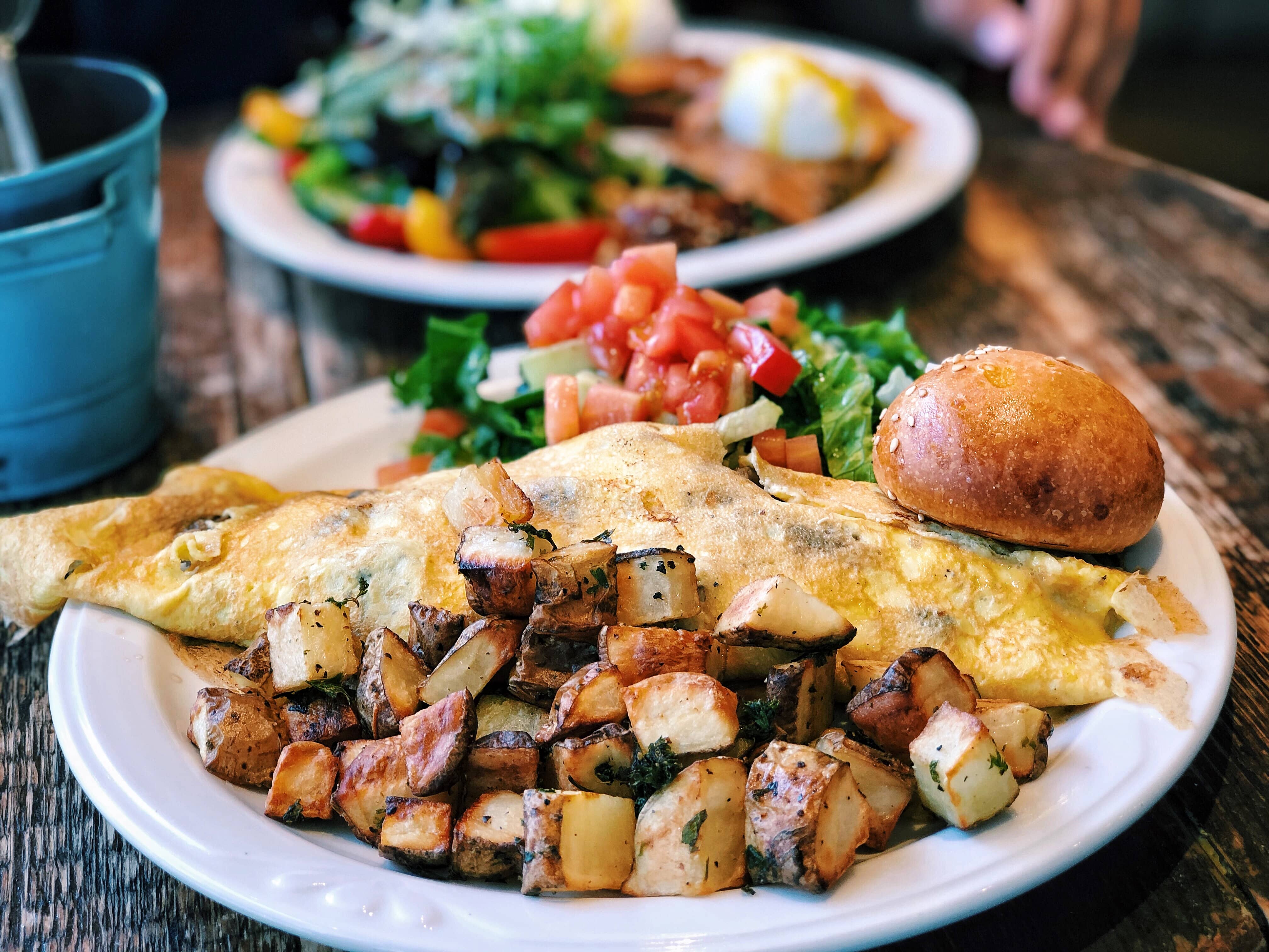 Itās not exactly a French rolled omelette, but it is folded vertically and stuffed with your choice of toppings. The omelette is accompanied by pommes florentine (roasted potatoes), that crispy Israeli side salad, and a brioche roll with marmalade and garlic butter. This dish is arguably the biggest bang for your buck - $11.75 for this omelette that can barely fit on the plate AND served with a generous portion of sides! Hereās a tip: spread some of that garlic butter for the roll onto the potatoes & omelette!