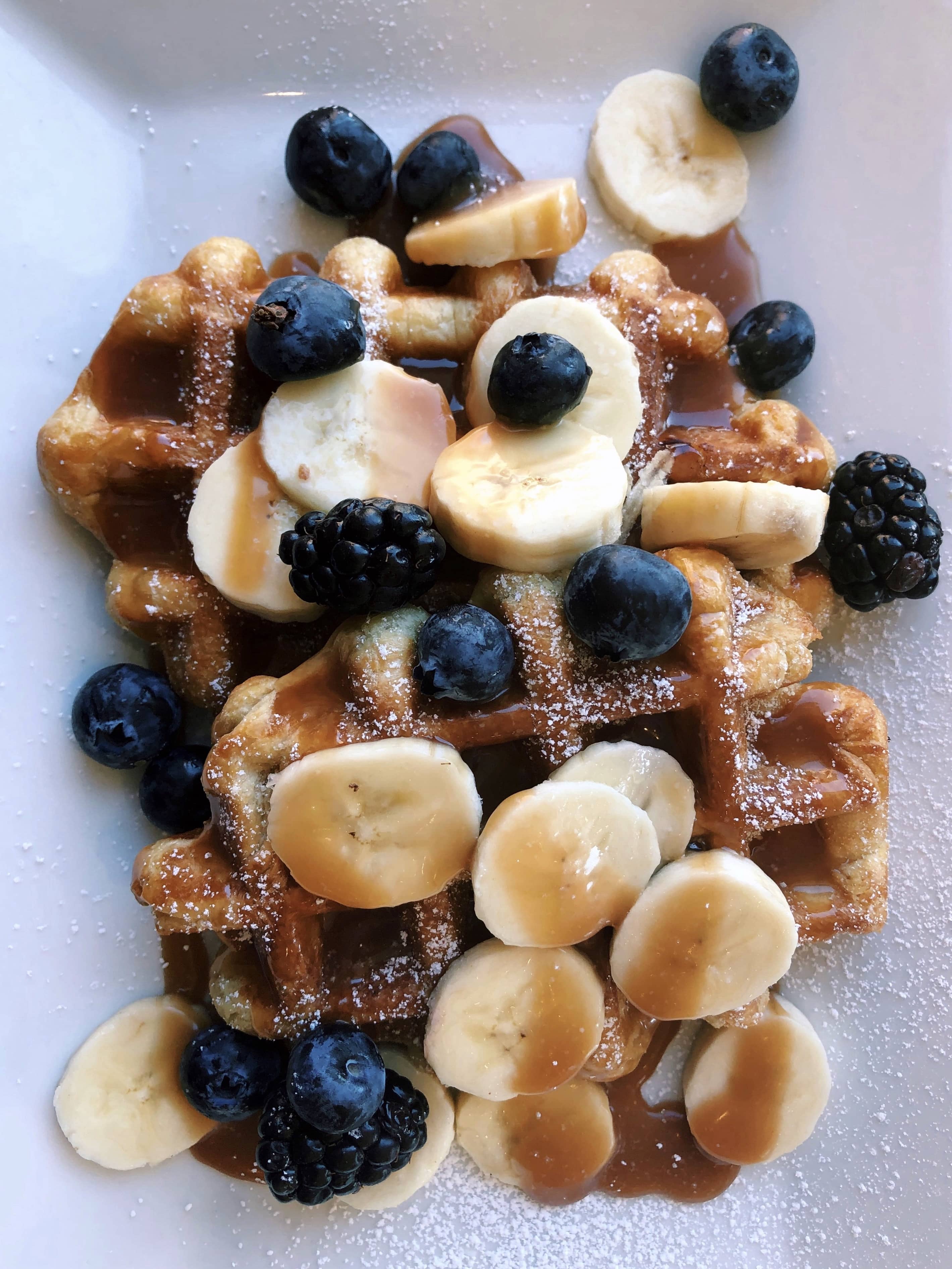 The portion for the price ($12.25) is a little small, nonetheless, this dish is fantastic. Waffles are great, but my favorite kind are liĆØge-style, which are yeast-risen brioche waffles covered with pearl sugar bits. LiĆØge waffles are so chewy, yet slightly crispy on the outside thanks to the pearl sugar studs. You can choose how you want your waffles to be topped - bananas + caramel sauce OR fresh berries + chocolate sauce. Shown above is the banana + caramel sauce combination, but they added blueberries anyways, probably due to excess. Their caramel sauce is SO INCREDIBLE!