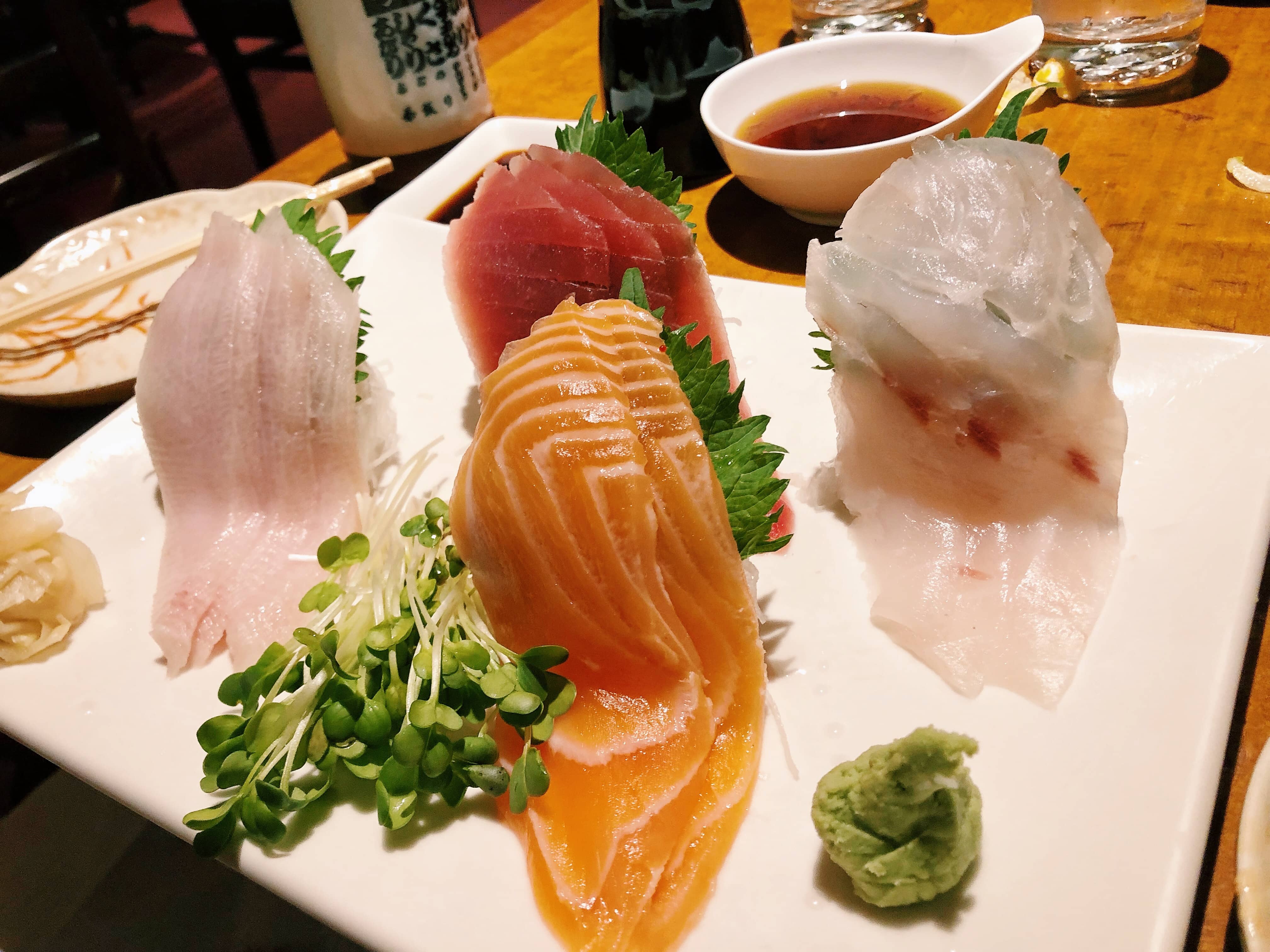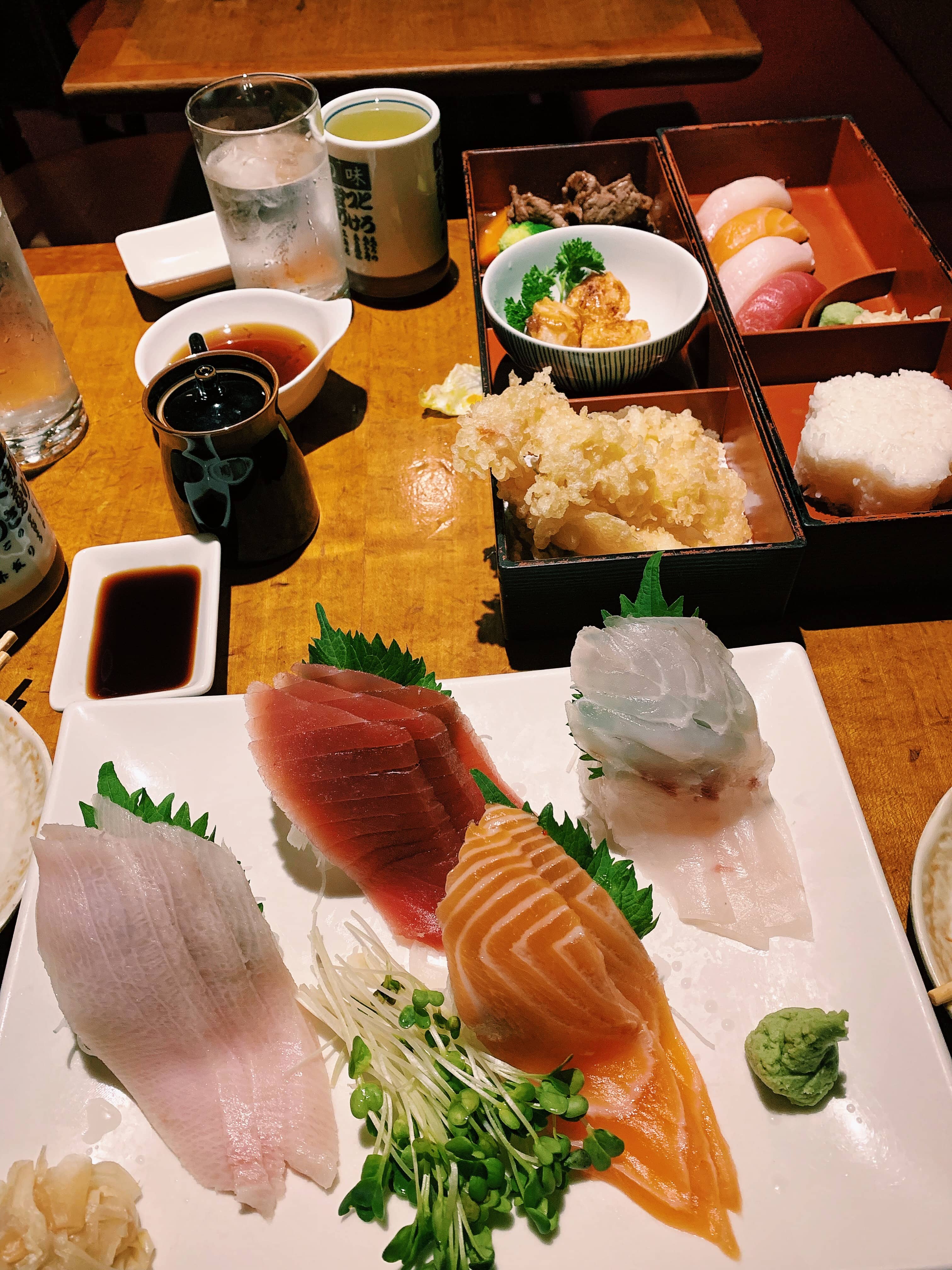 While my sister and dad get the sashimi entree, I opt for a hot dish-sushi combo bento box. A bento is simply a box of an assortment of rice/noodles, meat, & vegetables thatās very popular throughout East Asia. The photo at the very top is the lunch version, where you can choose 2 entrees out of many options, such as tonkatsu, ginger pork, tempura, sushi, hamachi kama, just to name a few. I love their chicken karaage, and even though I havenāt had a huge amount of karaage, this is my personal favorite! I also get their sushi, which is nigiri-style, which is just a slice of raw fish over sushi rice. I have noticed that the raw fish used on the sushi is warmer and not as high-quality as the sashimi alone, but itās still great. The steam from the rice does wlightly warm the raw fish a bit, so itās not the very chilled temperature that the sashimi retains. The box is accompanied with fresh orange slices and broiled fish - even for those arenāt the biggest fish fans (me), this fish is so tender, flaky, and well-flavored!
